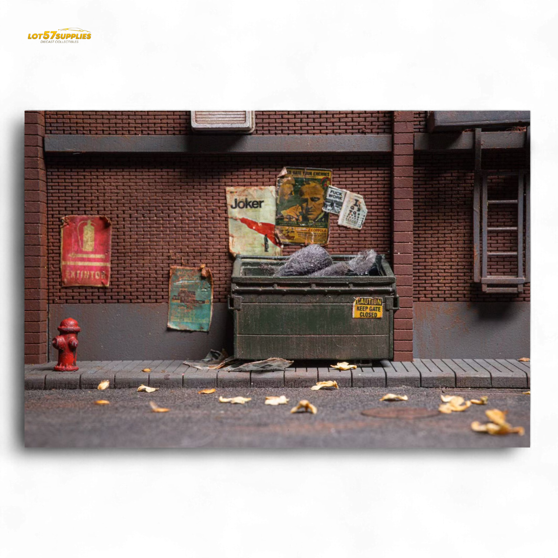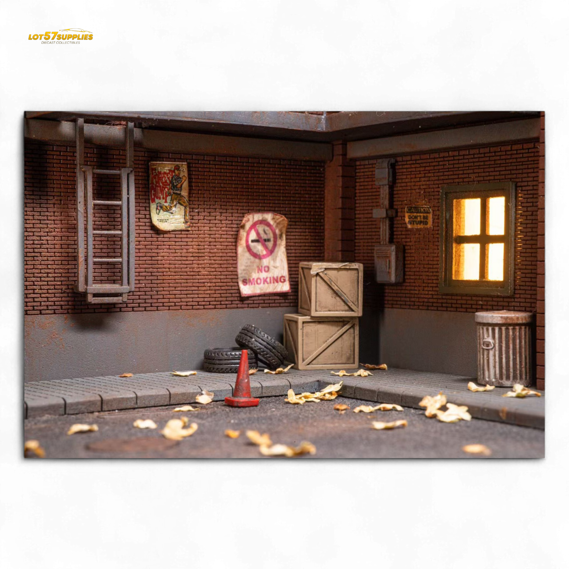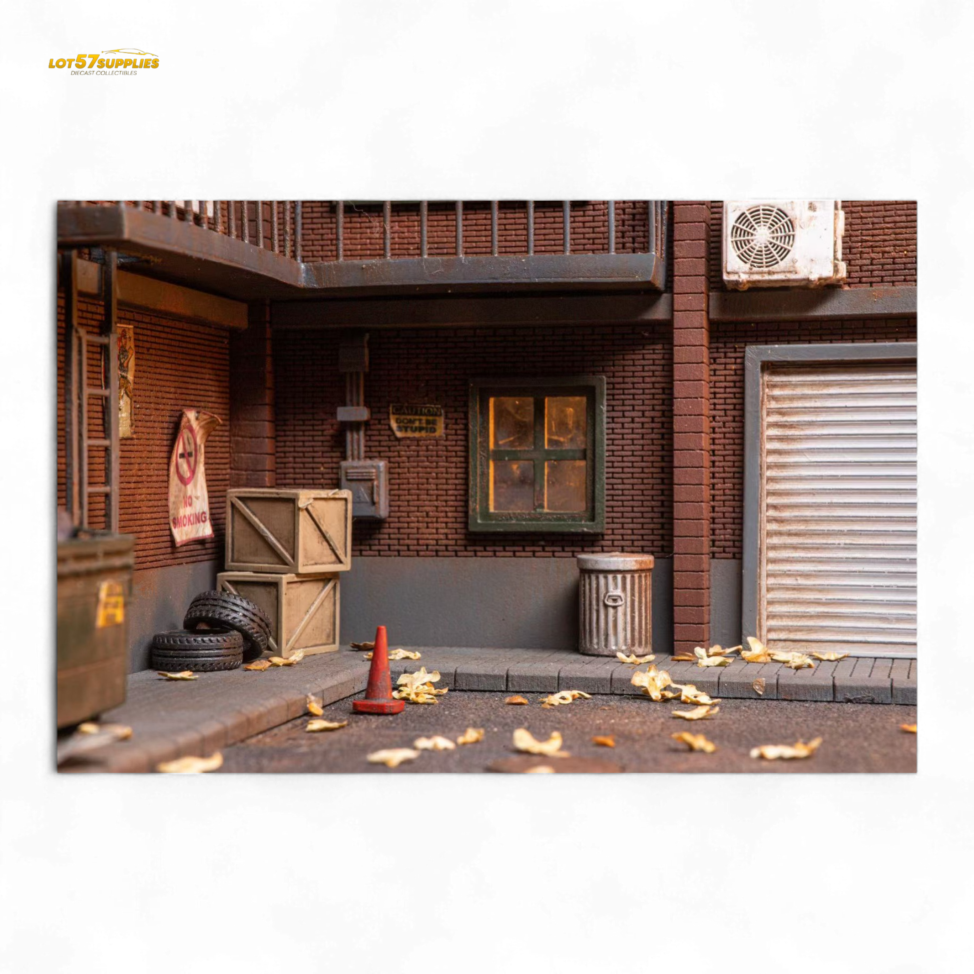 Step into the gritty charm of urban realism with this handcrafted 1:64 scale diorama. Designed for elite collectors, this back alley garage scene captures the raw street aesthetic — complete with detailed posters, garbage bins, crates, tires, and realistic debris scattered across the pavement.